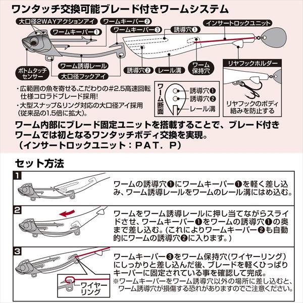 ヒラメ、マゴチを魅了するジグヘッド+ワームセット「RODEM」が、ブレード搭載&「R」の名を冠してブラッシュアップ!サーフフィネスゲームの新しい扉を開く「ブレードフィネス」対応モデル。誘導穴・誘導溝つきワームボディ採用によりワンタッチでボディ交換可能。リヤフックのボディ絡みを防止する、リヤフックホルダーを追加。