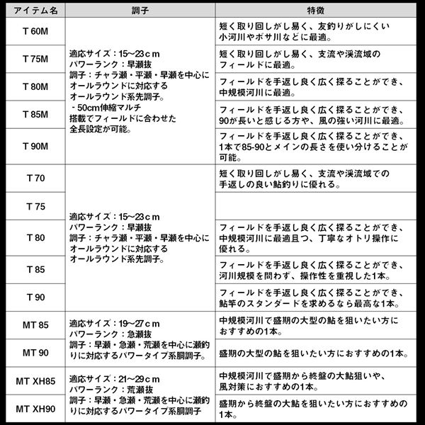 基本性能に磨きがかかった価格破壊の革命竿にショートオールラウンダー「T 75」とシリーズ最強パワーの「MT XH90/85」が追加。更なる軽量化を実現した「アバンサー」。新たに、支流攻略や風対策に最適な「T 75」と、尺鮎をも捻じ伏せるパワーの「MT XH90」と「MT XH85」をラインナップ。「T 75」は、ノンマルチで軽快且つ、小河川や支流を中心に幅広く使えるオールラウンド先調子モデル。「MT XH90」と「MT XH85」は、25cmオーバーから尺クラスの大鮎を狙うのに最適なパワータイプ胴調子モデル。パワータイプカーボンチューブラー標準替穂先(-20cm)を標準装備したことで、瀬釣り、更なる大型にも幅広く対応。価格以上のスペックで、初心者から上級者まで、鮎釣りを存分に楽しめる一竿。