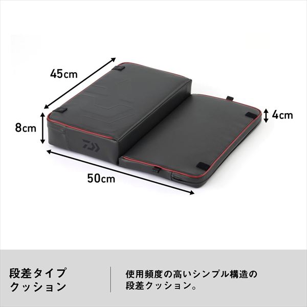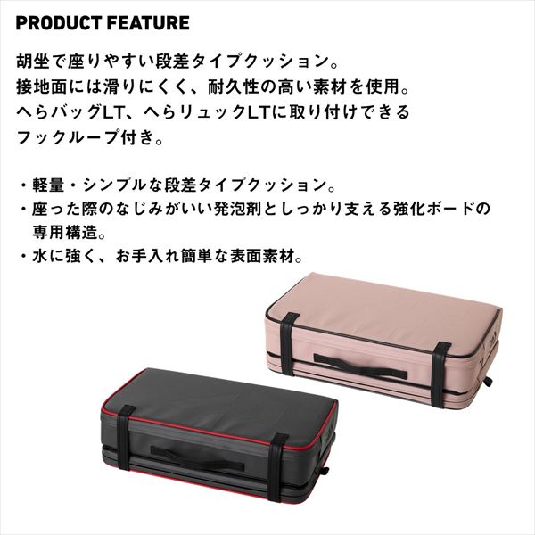 胡坐で座りやすい段差タイプクッション ◆軽量・シンプルな段差タイプクッション ◆座った際のなじみがいい発泡剤としっかり支える強化ボードの専用構造 ◆水に強く、お手入れ簡単な表面素材 ◆接地面には滑りにくく、耐久性の高い素材を使用 ◆へらバッグLT、へらリュックLTに取り付けできるフックループ付き