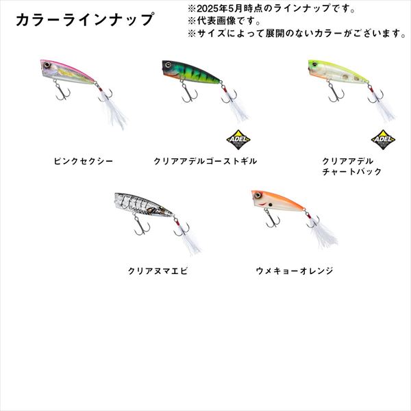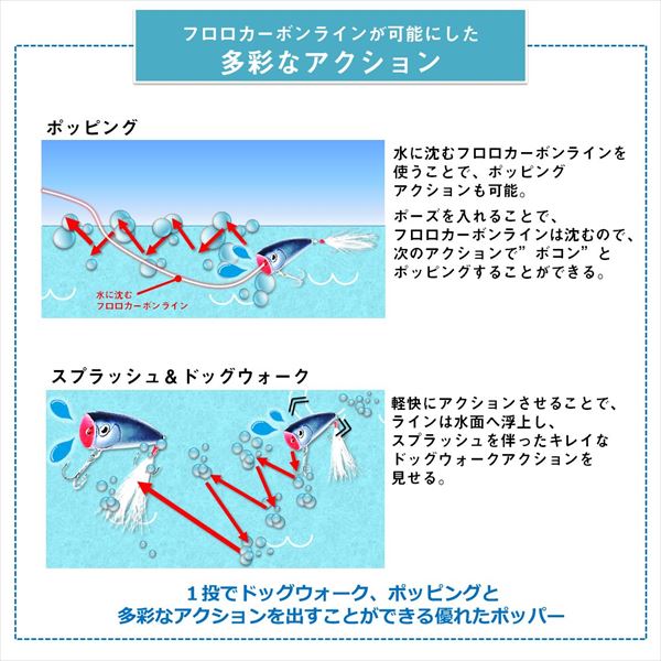 フロロカーボンラインでの使用を前提に開発されたハイパフォーマンスポッパー。多くのトップウォータープラグには、比重が軽く水に浮くナイロンラインやPEラインを使うことが推奨されており、きちんとアクションをつけるにはそれがほぼ必須の条件になっている。しかしながら持ち歩けるタックル数に限りがあるオカッパリや、極力ロッドの本数を減らしたいスモールボートでの釣行時には、トップウォーター用というだけでもうワンタックルを追加で準備することが困難な場合もある。スティーズポッパーはその浮力やバランス、アクションを調整し、現在のバスフィッシングにおいて主流といえる「フロロカーボンライン」での使用を前提として開発された、数少ないバーサタイル系タックル対応型のポッパーといえる。