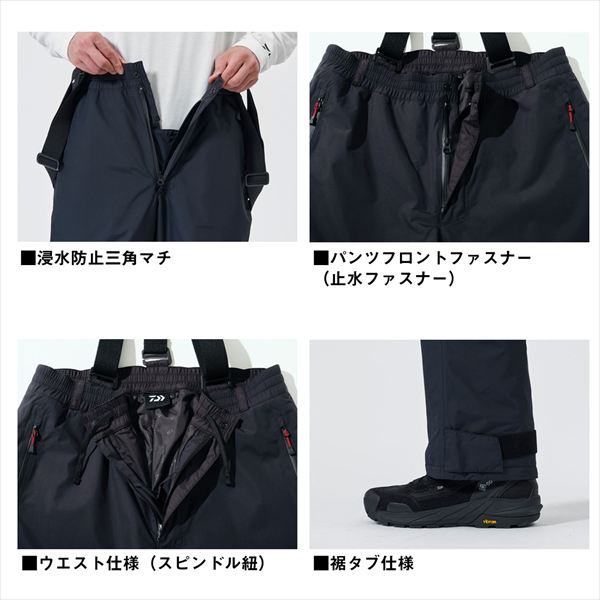 大盛中綿でしっかり温かい。磯・船用防寒モデル。防寒中綿を大盛り(通常の1.2倍)の120gを詰め込んだスーツ。安心感のある生地厚の防水透湿性に優れたRAINMAXの2層素材を採用。レトロなスポーティーさをデザインに落とし込み、暗闇でも目立つリフレクターパイピングを使用。袖口からの浸水を軽減するカフスを内袖に搭載し、衣服内の濡れを最小限に抑える。フローティングベストを着た際にも目立つよう、両肩にリフレクターロゴを配置。袖口回りは汚れが目立ちにくいブラック仕様。ポケットには水の浸入を軽減する止水ファスナーを採用し衣服内の濡れを最小限に抑える。パンツがずり落ちにくいサスペンダー付きモデル。