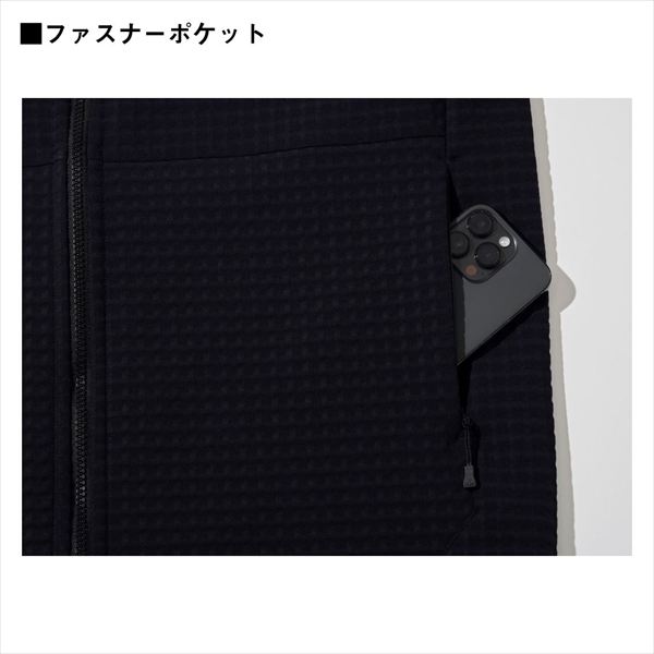 水濡れのリスクを考えたエクストリームフィッシング向けソフトシェルジャケット。表裏ともに撥水機能を有したソフトシェルと、空気層を組み合わせた特殊素材STORMEGAを採用。フリースや裏起毛のミドラーの場合、万が一濡れてしまった際に不快感やヒンヤリ感が持続するが、起毛面を表に出さない構造、かつ肌面は凹凸組織になっており、濡れた際も肌離れを持続し不快感も低減。肌面の凹凸によって体表面の空気の流れを維持することで、動きの多い釣りでのオーバーヒートのリスクも低減。寒い季節でも濡れる可能性のある、ロックショア、ウェーディング、オフショアなどのあらゆる釣りに最適。3層構造ながら、フィルムや接着材を介さない接結の製法を採用することで製品の軽量化を実現。ポケットは小物の収納に便利なファスナー付き仕様。裾にはスピンドルゴムを配し、裾が邪魔になる際や冷気を防ぎたいときに絞ることが可能。洗濯で繊維が抜けにくい組織を採用することで、長持ちでヘタりにくく、環境にも優しい。
