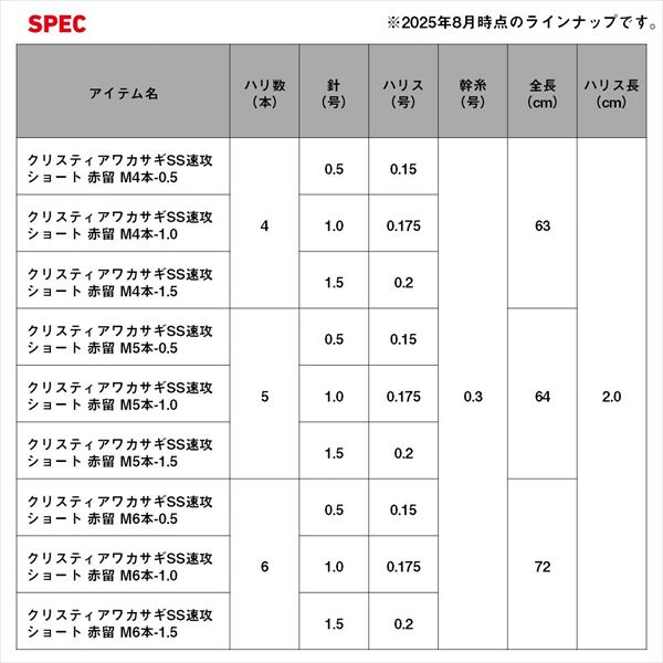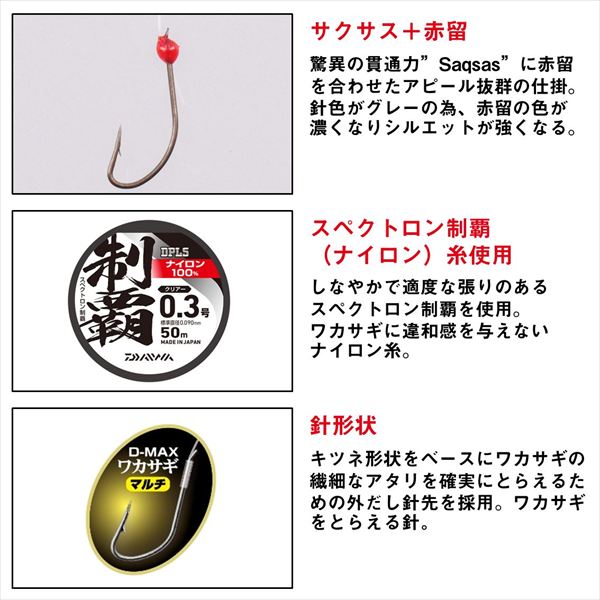 久保田テスター監修の速攻シリーズに新シリーズの追加。◆市場で絶大な支持を得る「赤留」はシチュエーションを選ばずシーズン初期〜氷上まで人気の高い留め色 ◆2024年に発売したショート夜光留と同じく、取り回しがしやすい4本針からラインナップ ◆サクサス+赤留。驚異の貫通力Saqsasに赤留を合わせたアピール抜群の仕掛。針色がグレーの為、赤留の色が濃くなりシルエットが強くなる。◆スペクトロン制覇(ナイロン)糸使用。しなやかで適度な張りのあるスペクトロン制覇を使用。ワカサギに違和感を与えないナイロン糸。◆D-MAXワカサギ マルチ・・・キツネ形状をベースにワカサギの繊細なアタリを確実にとらえるための外だし針先を採用。