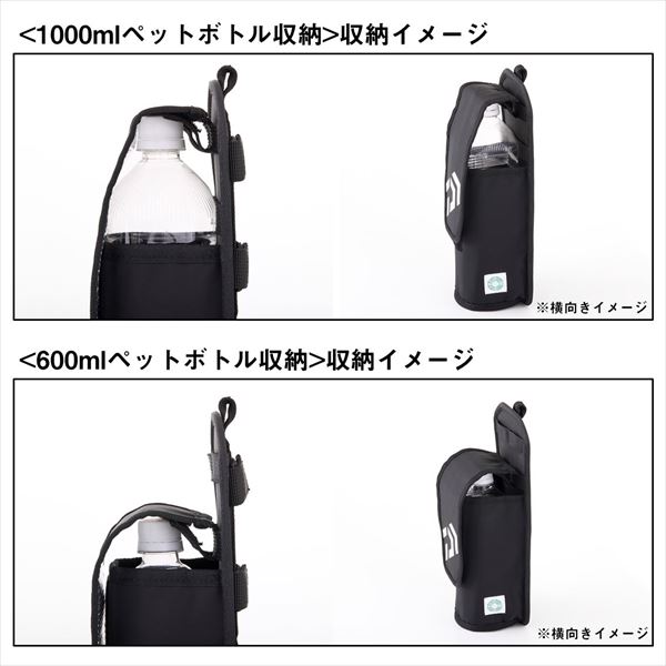 漁網リサイクル生地を使用した環境配慮の大容量ボトルホルダー。国内廃漁網のアップサイクル生地を商品の一部に使用している。1000mlペットボトル、水筒に対応した大型サイズ。大容量ペットボトル、水筒の両方に対応できる構造。また、フラップの取り付け位置を可変式にし様々なサイズをぴったり収納できる仕様。背面は縦横両方のベルトに装着可能な仕様。内部はアルミ蒸着生地を使用し簡易保冷機能。