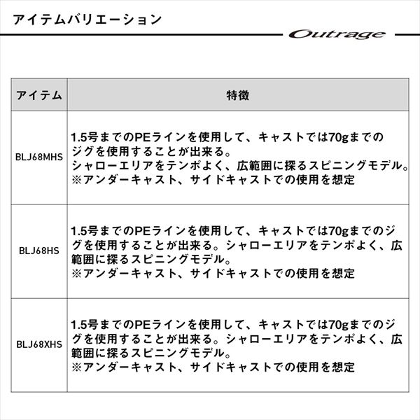 世界に通用するスペック・パワーを持たせたブレードジギングエントリーロッドの決定版。グローバルオフショアロッドシリーズ 「OUTRAGE XV」。OUTRAGEシリーズならではのロッドアクションを踏襲しながらも、世界中のフィールドに通用するスペック・パワーを持たせたラインナップを展開。本気でターゲットを攻略出来るポテンシャルを備える。その中でもブレードジギングモデルは、ジグをキャストしやすいセッティングを採用。バイトを弾きにくいしなやかなティップと青物とも真っ向勝負可能なパワーのあるブランクを有する。■68XHS・・・2号までのPEラインを使用して、キャストでは130gまでのジグを使用することが出来る。ディープエリアやドテラ流しに相性のよいパワフルスピニングモデル。