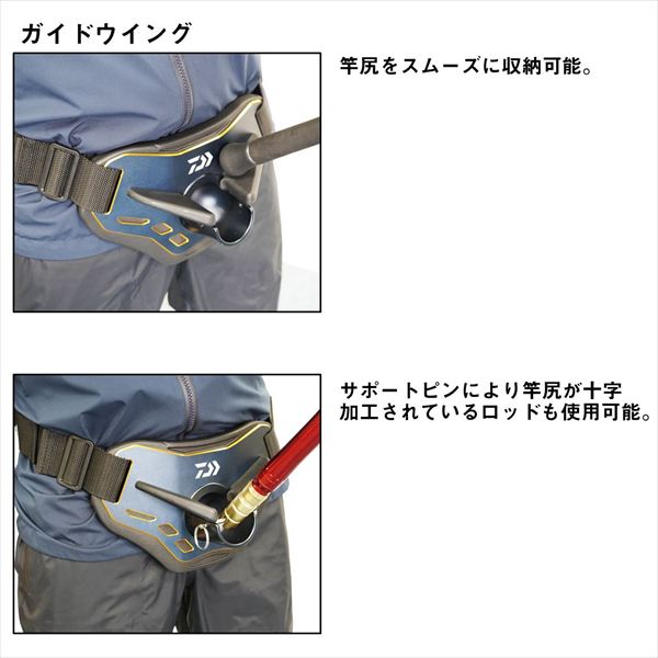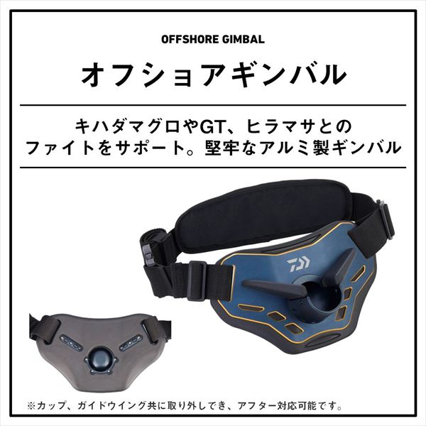 キハダマグロやGT、ヒラマサとのファイトをサポート! 堅牢なアルミ製ギンバル。◆50mm幅広ベルトで腰回りが安定しファイトがしやすい  ◆幅広サポートパッドでアングラーの負担を軽減 ◆マシンカットで精巧に作られた堅牢カップ(45mmのグリップエンドまで対応) ◆ガイドウイングによって不意の大物でも竿尻をスムーズに収納可能 ◆着脱可能なサポートピン付属 ◆カップ、ガイドウイング共に取り外しでき、アフター対応可能