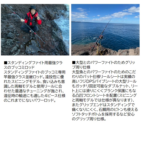 未知なる大物へ挑む。BKG(ブッコミゲーム)シリーズの並継シリーズ。BKG(ブッコミゲーム)はダイワが提案する磯や堤防からエサを投げ込み、未知なる大物と対峙するシンプルでエキサイティングなゲームフィッシングスタイル。バトルゲームBKG(並継)シリーズはブッコミ釣りに適した仕様を具現化した専用シリーズ。並継化することで最適な調子バランスとガイド設定が可能となり、より理想のアクションを実現。両軸モデル(B)は食い込みも意識したトップに、ショックリーダーの使用時もストレス無いよう大口径両足タイプのガイドを多点セッティング。スタンディングファイトで最大級の大型魚と対峙するためのパワーロッド