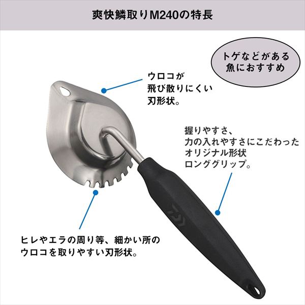 「ウロコが飛び散らない」「ウロコが簡単に取れる」をキーワードにたどり着いたダイワのオリジナル形状鱗取り。「爽快シリーズ」は、釣りの楽しみを「食」に繋げる、魚を捌くことにこだわった新シリーズ。魚のウロコを飛ばさず、取りやすいオリジナル形状。刃部後端についたギザ刃でヒレやエラ周り等細かい所のウロコを取りやすい。サビに強いステンレス素材を使用。S字フックなどでぶら下げれる本体穴。握りやすさ、力の入れやすさにこだわったオリジナル形状グリップ。爽快鱗取りMは、グリップが直接鱗取りについているので力を入れやすい。爽快鱗取りM240は、ロンググリップによってトゲなどがある魚におすすめ。