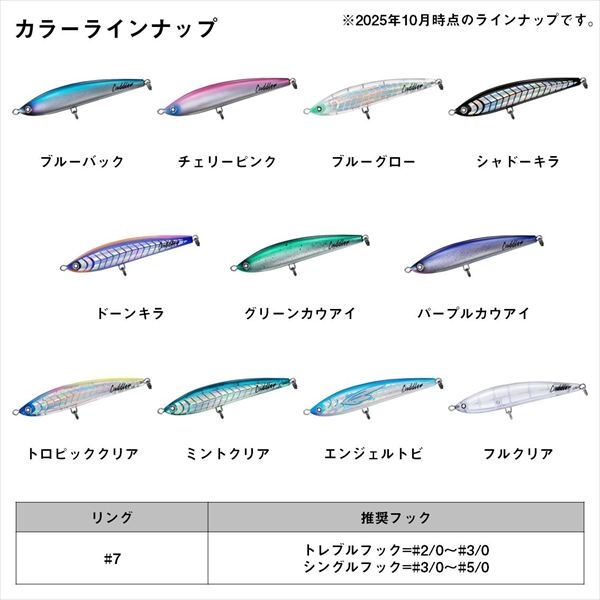 未知なる冒険へ!瀬川良太監修モデル。ソルティガカドラーに求めたものは、飛距離とタフコンディションでもしっかり泳ぐスイムアクションである。テールを絞り込み、空気抵抗を大きく減らし、強い向かい風や横風でもバランスを崩さない安定した飛行姿勢を可能にするフォルムにより、飛距離での大きなアドバンテージを生み出した。また、背面カウンターウエイトを搭載し、浮き上がりの姿勢にこだわり、水面が荒れていても同じ姿勢で浮き上がるように調整し、水面のコンディションを問わない水中へのダイブを可能とした。追求したアクションは立体螺旋S字アクションで、ボディ全体がワイドに動き、広範囲から魚を引き寄せる。