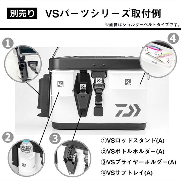 基本性能を高次元で追求!VSパーツで更に機能アップ!!船上で必要とされる機能を高次元で追求!雨・シブキに強く、置いた小物が転げ落ちにくい「ハードかぶせブタ」。フタは「面ファスナー」で簡単開閉、「バックル」でしっかりロック。高剛性セミハードボディー。移動時の安定感があり、汚れが落としやすい「成型ハンドル」タイプ。お手入れ簡単「底角部丸型形状」。別売のVSパーツシリーズでバーサタイルに使用可能。更に利便性アップ。システムツールバッグ(A)、小型タックルボックスの収納にも対応。