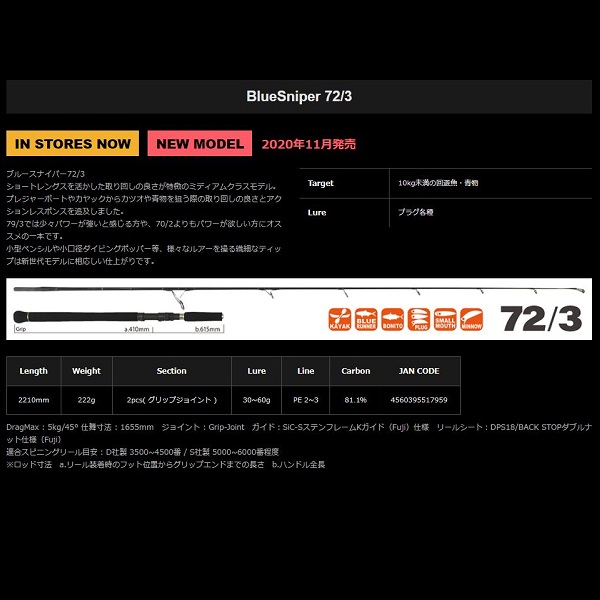 『ブルースナイパー 72/3-小型ボートでの可能性を広げる軽快な取り回しと操作感、強靱なバットパワーを融合したモデル』ショートレングスを活かした取り回しの良さが特徴のミディアムクラスモデル。プレジャーボートやカヤックからカツオや青物を狙う際の取り回しの良さとアクションレスポンスを追及しました。79/3では少々パワーが強いと感じる方や、70/2よりもパワーが欲しい方にオススメの一本です。小型ペンシルや小口径ダイビングポッパー等、様々なルアーを操る繊細なティップは新世代モデルに相応しい仕上がりです。