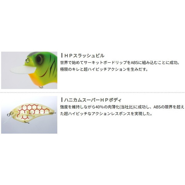 異次元ハイパフォーマンスマシン誕生!フラットサイドクランクは、フラット面が広いゆえに、強烈なフラッシングを伴いながら、強い波動を広く伝える実戦的なルアーである。ただ巻きしただけで広範囲からバスを寄せる力が強く、その力だけを比べればラウンドクランクを確実に上回る。逆にラウンドクランクに対して劣るのがキャスタビリティとスナッグレス性能、そして浮力である。これはフラットサイドの構造的弱点で、これまで同ルアーが一部のエキスパートだけのものであった理由でもある。しかしルアーローテーションの一角として確実に必要とされる場面が増えているのも事実。フラットサイドだけがハマル状況が少なくないからだ。そこでフラットサイドの弱点を克服し、素材を問わずNo.1性能を目指したのがHPFクランクである。