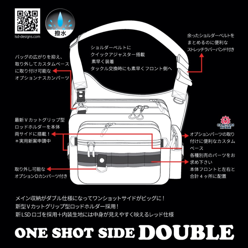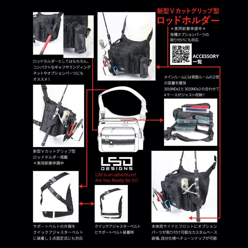 メイン収納がダブル仕様になってワンショットサイドがビッグに!内装生地に中身が見やすく映えるレッドを使った新LSDロゴ採用モデル。メインルームには背面ルームの2倍の容量を確保。3010NDx2と3020NDx2の合わせて4ケースがジャスト収納!本体背面側に新設のポケットにはVS3020とVS3010クラスのケース合わせて2個が収納可能。背面ポケットにはA4や13インチのLapTop(ノートPC)も収納可能でビジネスユーズにもオススメ。LSD初の3点式サポートベルト搭載でフィット感アップ&ガッチリ固定!クイックアジャスターも装備し、バッグの付け外しもイージー。サポートベルトはウェストに取り付けて4点での固定も可能。本体両サイドにVカットグリップ型ロッドホルダー採用 (*実用新案申請中)。ロッドホルダーとしてはもちろんオプションパーツの取り付けも可能。Vカットグリップ型ロッドホルダーはコンパクトなギャフやランディングネットにもオススメで、バスやソルトゲームでのランガンにも最適。