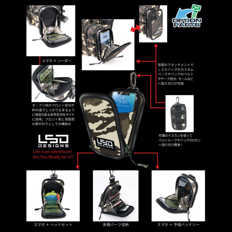 LSDバッグのカスタムベースやフィッシングゲームベストに取り付け可能なタックルポーチ。リーダーやフィッシングパーツ、スマホや鍵の収納に!ショックリーダー(小型)やフィッシングパーツ、スマホ、鍵などの収納に。スマホ + 予備バッテリーも入るサイズで、非接触充電しながらの収納にも。(スマホや予備バッテリーのサイズにより収納できない場合がございます)インナー背面にはタイトポケットを装備。オープン時にフロント部分が45°(約)で止まるストッパー機構により中身の落下を防止し、開けたままでの使用も可能。ナスカン部分にDカン、内部にもナスカンを装備することで鍵などの落下防止に。素早い開閉ができるダブルスライダージッパー。背面のアタッチメントでLSDバッグのカスタムベースやベルト、船の手すりやベルトなど様々な場所に取り付けが可能。ナスカン付属でベルトループやDカンなどにも取り付け簡単!衝撃吸収ウレタンフォームを内蔵し、収納したボックスをしっかりとガード。汚れや水に強い撥水加工生地を使用。