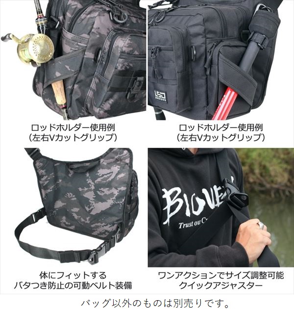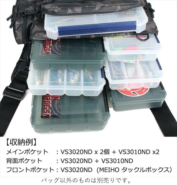 ワンショットサイドネオの容量をアップし、両サイドにロッドホルダーを装備したモデル。MEIHO VS3020ND x4つと VS3010ND×2つを収納できる大容量ショルダーバッグ。バス、シーバス、エギングなど様々な魚種に対応し、川から海まで幅広いシチュエーションにおすすめ。メインポケットにはMEIHO VS3020ND×2つとVS3010ND×2つの合計4つのケースがジャストフィット。パーツや小物の整理に便利な内ポケットやジッパー付きポケットも装備。内装生地には、ポケットを開けた時に中身が見やすいレッドを採用。背面側のリザーブポケットはMEIHO VS3020NDとVS3010NDが入るサイズ。A4や13インチサイズのノートPCも収納可能でビジネスユーズにも。使用頻度の高いフロントポケットにはMEIHO VS3020NDを収納可能。フロントポケット内にジッパー付きメッシュポケットなどの内ポケットを装備。