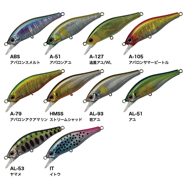 その革新的なコンセプトとフォルムで多大な影響を与えたフラットサイドトゥイッチングミノーのアレキサンドラ。釣り上がりからのアップやアップクロスでピンスポットを撃ち抜き、ロッド操作により最小限の移動距離で効果的なイレギュラーアクションで魚を挑発する。そんな先鋭的な釣りを提案した先駆けのルアーであったと確信しています。小渓流や小沢のアップストリームでの繊細かつ大胆なゲーム、スタンダードな渓流でのレンジを意識したフォーリングからのシェイキングを駆使したサイトフィッシング、春から秋の移りゆく季節、その全てのシーンに対応する基本性能の確かさはアングラーの信頼の裏切りません。ウエイトの形状と位置は着水後のバックスライドさせるようにセッティング。フォーリング姿勢をレベルフォールに近づけ、より強固になったボディを纏い際どいポイントへのアプローチにもたじろぐことはないはずです。さらに本流、遡上系に対応する70mmをラインナップに加えます。イレギュラーアクションや飛び、引き抵抗の軽さといった美点を継承、数少ないチャンスを逃さない能力をフィールドで体感してください。
