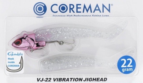 バイブレーションするジグヘッドという新ジャンル!ハードとソフトのマッチングによって衝撃の釣果をもたらします!経験によって導き出されたジグヘッドデザインと、装着するコアマンワームとのマッチングで、ボディ全体が絶妙に揺れるバイブレーションを発生します。圧倒的な食わせ能力をもつワームが、より細かく振動してシーバスを強烈に誘う。しかもそれがまたぶっ飛びの飛距離なので、完全に反則レベルです。22gのウエイト設定によって水深3mより下の中層以下を得意とします。16gよりも確実に下のレンジをきっちりとトレースすることが可能です。スレたシーバスをバイトにまで持ち込むことの出来るこのルアーが、新しい領域を拓きます。VJの圧倒的パフォーマンス。間違いないです。