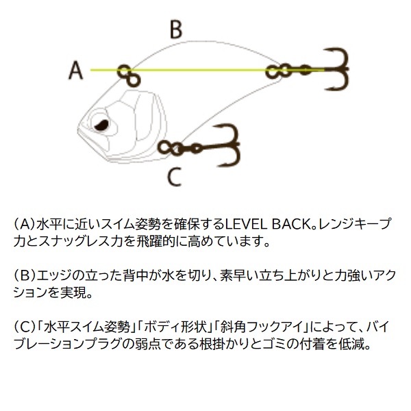 岸釣りにおけるハードベイトの釣りをやり込んできたRAID JAPANのコダワリを凝縮したバイブレーションプラグ、LEVEL VIB。レベルバイブは従来の50mmクラスのバイブレーションにありがちだった、飛ばない 速巻きできない ウィードやゴミの付着に弱いなどといったウィークポイントを徹底改善した上で、バイブレーションに必要な飛距離 速巻き対応 遅巻き対応 馬力 レスポンス レンジキープ力の6項目を高次元でクリア。岸釣りにおけるバイブレーションゲームの死角を徹底排除した、NEXT LEVELへのステップアップバイブレーションが、LEVEL VIBです。