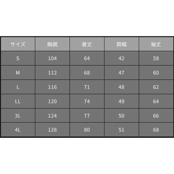 サイズ:M(胸囲112cm、着丈68cm、肩幅47cm、袖丈60cm)