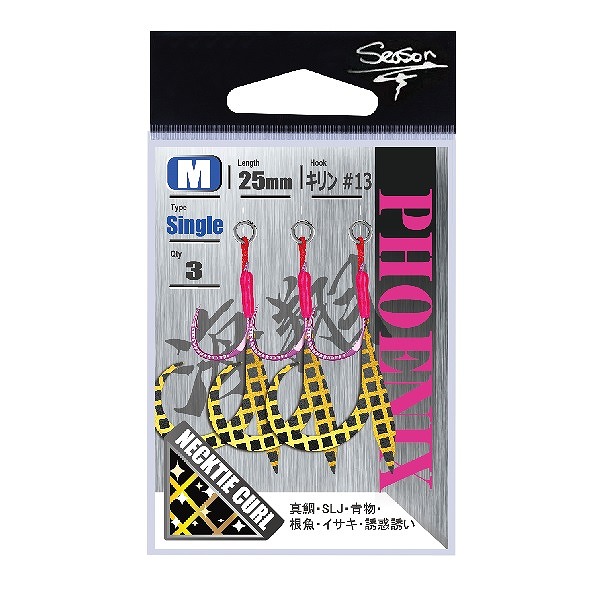 ネクタイはフォールと巻き上げ時に絶大な効果を発揮し、魚の食い気を増幅させバイトを誘発。。装飾されたフックは、乱反射を起こし派手にアピール。嘗てない新軸のアシストフック実現した。