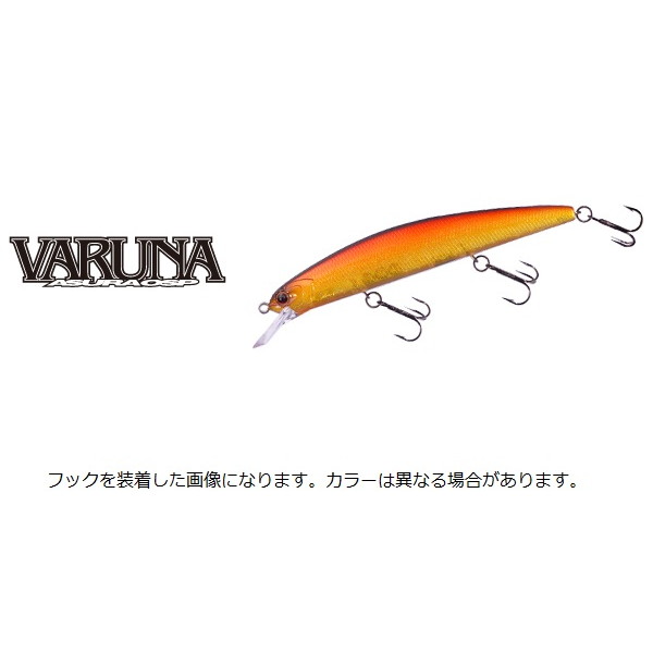 伝統のフルフラットボディによるフラッシングと強い水押しは確実にバイトを倍増。小口径トリプルタングステン重心移動はウエイトを尻尾付近にまで到達させ、安定した飛行姿勢によるアキュラシーとロングキャスト性能を実現。これは独特のサウンドやウエイトの低重心化にも貢献し、軽量化と強度を両立したハニカムスーパーHPボディとの融合でハイレスポンスで泳ぎ出しの良いストップ&ゴー、さらにはストレートリトリーブでのバイト誘発力も最上点に達した。最大深度はタダ巻で水面から2.1m、ただ巻からの連続ジャークでは2.8mまで潜るという特徴的な性能を見せる。また、ありがちな早巻きでのバタつきも抑えオールスピードで食わせられることは強力な武器となる。トゥイッチやジャークでは軽い力で簡単にキレの良い首振りができることでプレッシャーをかけず、移動距離を抑え、低水温期のスローなバスでも広範囲から引き付ける時間を稼いでくれる。VARUNAは全性能を最高次元に到達させた最強の11cmミノーとなる。