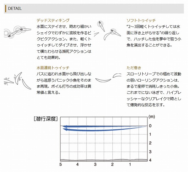 狙いはペンシルベイトやショートリップミノーには出せない”体で曲る曲線的なくねりアクション”。ダートも距離ではなく、どちらに曲るか分からないトリッキーな3Dダートである。しかも弱った小魚を演出する為、糸ふけを軽く張る程度のソフトなロッドワークで首を振ってくれ、その移動距離の短かさにより一点でじっくり誘う事ができるのも大きなメリット。リップ付きルアーには不可能で、かといってリップレスミノーにも不可能な独自のアクションは未体験の爆発的な働きを見せてくれる。