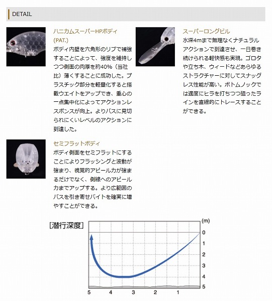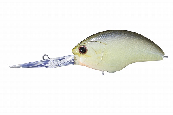 一年を通じてみると水深3〜4mはほとんどのフィールドで必ずカギとなるシーズンがあり、安定した水温やベイトの量などから決して外せないレンジである。この3〜4mレンジはファーストムービングルアーでなければ広く探り切る事はできない。通常4mまで潜るクランクは、潜らせる為のリトリーブ距離、つまり飛距離が必要で、その為にボディサイズも大きく重量があり、しかも重心移動が搭載されている場合が多いのが実状だ。しかしメジャーレイクやアングラーの集中する休日、またはベイトのサイズによっては、そのタイプでは全てをまかなう事は到底難しく、ボディサイズの常識を超えたディープクランクの必要性を強く感じていた。EX-DRはコンパクトなボディに加えて重心移動を使わない事を条件に開発された。重心移動を排除すると飛びと泳ぎを両立する為に開発の難易度は数段増すものの得られる性能は何物にも代え難い。オモリを誘導する為のリブが不要なので、贅肉のないボディは泳ぎ出しが速くストップ&ゴーでのバイト率が向上し、スローでも喰わせられるアクションを持続する。早巻きでもよりハイスピードに耐えられるなど全てのアクション性能が向上。課題であった自重12gで重心移動を使わずして4m潜るだけの飛距離を稼ぐセッティングにも成功した。ボディは横幅をやや絞りシャッド的なシルエットも意識したタフコンディションに強い縦扁平形状を採用。側面はセミフラットで波動とフラッシングを発生しやすく、広くバスにアピールする上に喰わせのキッカケも作ってくれる。タフなバスを喰わせの為に、ある意味シャッド的なライブリーさを持ったナチュラルアクションでいながらスムースにいち早く4mに到達する、これまでの常識を覆すディープクランクが誕生した。