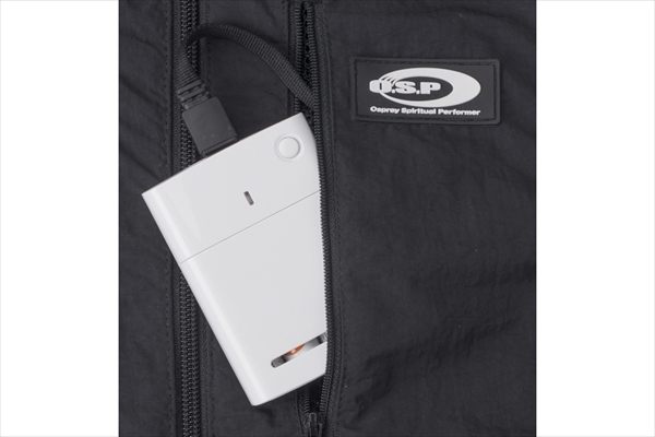 胸の両サイドポケットにモバイルバッテリーを収納できUSBコードは裏面の穴からポケット内に入れることが可能です。