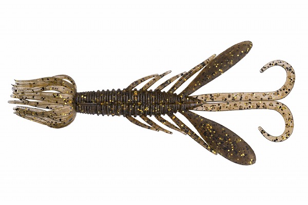 ドライブホッグは、2.5インチの小さなシルエットにそれぞれ動きを追求したパーツを集結することで、圧倒的なライブリーアクションと力強い水押しの両立を適えた。なかでもフラスカートは大きな役割を担う。フワッとフレアしピリピリとハイピッチに震える抜群の誘い性能に加え、抵抗となることで常に水を押し、ダウンショットリグ(シンカー5g前後)のフリーフォールではボディをウォブリングさせる独自の自発的アクションを発生。