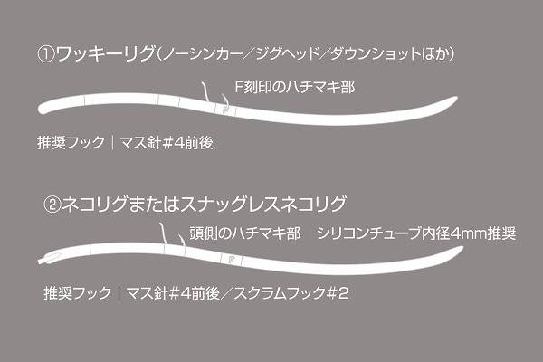 ストレートワームでも絶妙なボリューム感の使い分けで釣果が左右される昨今のフィールド事情。トーナメントや人が賑わう休日メジャースポットといった極限のプレッシャーの中でもバイトまで持ち込ませる釣りにフィネスロングワームがある。ドライブクローラースリム8.6はスレっからしのバスでさえ突進バイトさせるべく開発スタートとなった。ロングワーム特有の波立つようなウネリアクションを最優先し、ヘッドからテール部分まで超極浅リブでデザイン。超極浅リブはリング形状リブのドライブクローラーシリーズ同サイズで比べると弱波動で、スリムなシルエットはバスへ必要以上の警戒心を与えることなく興味を引かせ弱波動と相まって喰わせてしまう力を持つ。ドライブクローラースリム8.6はノーシンカーワッキーによるフィネスなアプローチから、2.6g程度のネイルシンカーを使用したカバーネコリグでもストレス無く扱える様に、喰わせ能力を損なわずギリギリまでスリムにしたボディと長さ、それにベストマッチなマテリアル選定で設計。ストレートワームの新戦略としてバスのバイトを誘う。