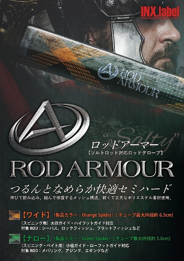 インクスレーベル・オリジナルサイズRod gloveライトソルトロッド完全対応! 極軽&高反発マイクロメッシュ素材のセミハードなロッド保護チューブ伸びてつるんと飲み込み縮んで保護するマイクロメッシュ構造。滑りの良いセミハードな素材(ポリエステル)で車載中でのガイド絡みやロッドホルダーへの引っ掛かりなどを防ぎ、釣り場では磯や堤防での置き傷や当て傷から守り、藪漕ぎ時でもガイドが引っかかることなくスムーズに運べます。渡船などに複数本のロッドを積み込む際にも、ロッドアーマーに入れたものを束ねてロッドベルトで止めれば、竿同士ガイド絡みも無く快適です。ワンピースロッドや、ツーピースロッドを繋いでリールもリグもセットしている場合でも、ロングやミディアムを上から被せることも出来ます。車載で港から港へランガンする場合でも、ルアーやリグを付けたままロッドをたたむことなく安全に運べます。