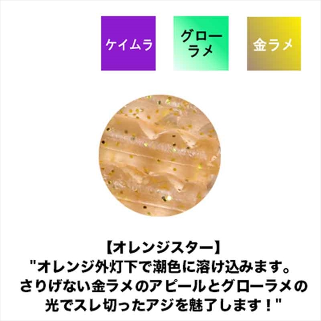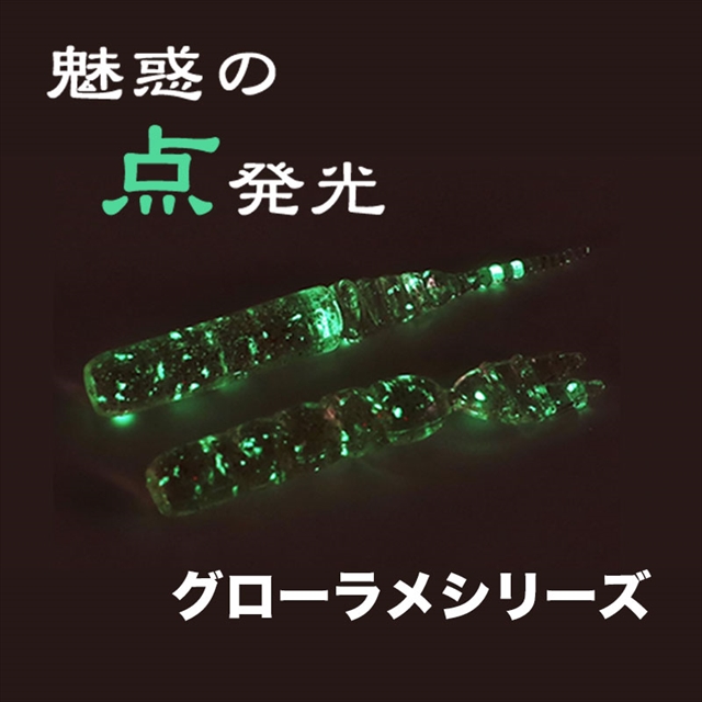 ( グローラメシリーズ )アジング・メバリングに於いてワームカラーは釣果に大きく影響する事が多くとても重要視しております。キモになると考えているのは(光り)です。通常のラメは反射系ラメが多く、瞬間的な光りでアジ・メバルにアピールします。またラメのカラーで反射力が変わり、潮色や活性に応じたラメカラーをチョイスする事でより効果的にアピールが可能です。(グローラメシリーズ)はラメ自体が蓄光し発光し続け反射系のラメとは違う光りで強烈にアピールします。グローラメも様ーな種類があるのですが、ワーム内でグローラメが散らばり易く、それぞれが強烈に光る様に大き過ぎず強く発光するグローラメを採用致しました。「ベースカラー」「組み合わせるラメカラー」でそれぞれの個性が増しております。※掲載している商品の画像は代表画像を表示しています。また実物と色が違って見える場合があります。あらかじめご了承下さい。