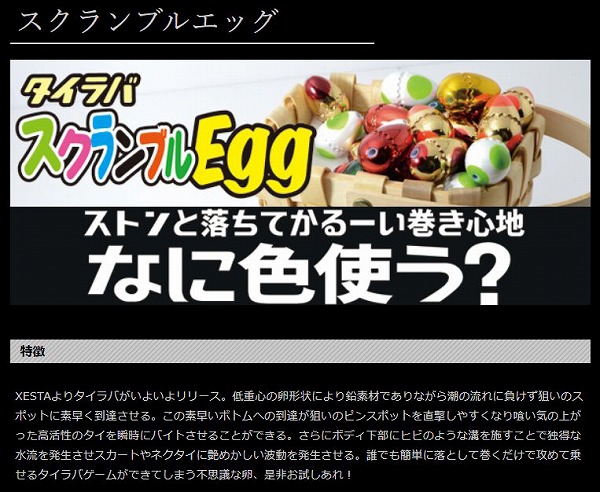 XESTAよりタイラバがいよいよリリース。低重心の卵形状により鉛素材でありながら潮の流れに負けず狙いのスポットに素早く到達させる。この素早いボトムへの到達が狙いのピンスポットを直撃しやすくなり喰い気の上がった高活性のタイを瞬時にバイトさせることができる。さらにボディ下部にヒビのような溝を施すことで独得な水流を発生させスカートやネクタイに艶めかしい波動を発生させる。誰でも簡単に落として巻くだけで攻めて乗せるタイラバゲームができてしまう不思議な卵、是非お試しあれ!※掲載している商品の画像は代表画像を表示しています。また実物と色が違って見える場合があります。あらかじめご了承下さい。