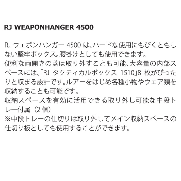 RJ ウェポンハンガー 4500は、ハードな使用にもびくともしない堅牢ボックス。腰掛けとしても使用できます。便利な両開きの蓋は取り外すことも可能、大容量の内部スペースには、「RJタクティカルボックス1510」8枚がぴったりと収まる設計です。ルアーをはじめ各種小物やウェア類を収納することも可能です。収納スペースを有効に活用できる取り外し可能な中断トレー付属(2個) ※中断トレーの仕切りは取り外してメイン収納スペースの仕切り板としても使用することができます。