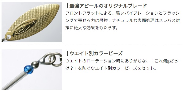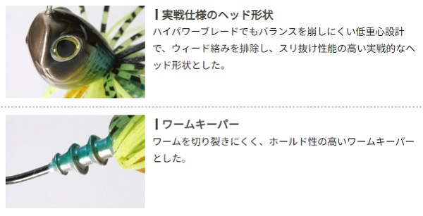 ハイピッチャーはプレッシャーがかかった状況下でも確実にビックバスをモノにできる中小型スピナーベイトとして開発された。もちろん日本だけに限らずアメリカでも実戦投入し、寄せて喰わせて獲れる性能を完璧にクリアしている。特に最も釣果に影響するブレードについては徹底的にこだわり、他とは違う泳ぎを追及した。一般的なブレードとは逆のカップ形状で、フロントがフラットでリアが深い。つまりフロントが点ではなく円を描いて回ることによりスイベルまで回転させ、アッパーアームを大きくゆらし、ヘッドにまでしっかり振動を伝えることに成功している。その結果、このサイズとしてはトップクラスの超高速回転ピッチと強いバイブレーションを実現した。また、ブレード表面にはナチュラルな輝きの表面処理が施されており、スレ難くタフコンディションに強い上に、フラット面がフラッシング効果を高め、集魚力を格段に向上させた。フックも対ビックバスを強く意識した仕様とした。