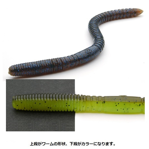 RAID JAPAN初となるストレートワーム(WHIP CRAWLER)に求めたものは、あらゆるリグに対応するオールマイティー性能。ストレートワームの命とも言える(素材の張り)を殺す事なく、(硬過ぎず柔らか過ぎない)、(太すぎず細すぎない)、(重過ぎず軽過ぎない)ベストなバランスを導き出し、使用するリグや釣り場の状況さえも選ばない徹底したオールマイティー性能が持ち味です。