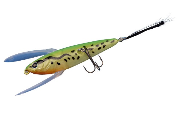 弱ったベイトフィッシュが水面でもがいているスローアクションを出すための羽ですが、羽というとらえ方ではなく、数匹のベイトが絡み合っているというイメージ!シェイクによるもがきアクションだけではなく、ただ巻きでのバタバタアクションも可能。止めてよし・揺らしてよし、巻いてよし。あらゆる誘いができる食わせのトップウォータープラグです。※掲載している商品の画像は代表画像を表示しています。また実物と色が違って見える場合があります。あらかじめご了承下さい。