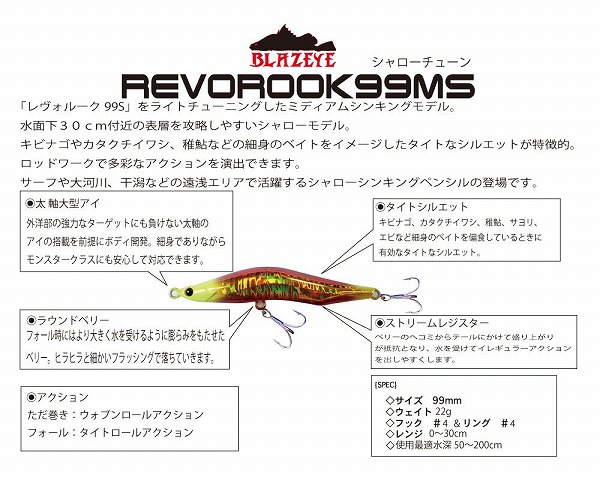 「レヴォルーク99S」をライトチューニングしたミディアムシンキングモデル。水面下30cm付近の表層を攻略しやすいシャローモデル。キビナゴやカタクチイワシ、稚鮎などの細身のベイトをイメージしたタイトなシルエットが特徴的。ロッドワークで多彩なアクションを演出できます。サーフや大河川、干潟などの遠浅エリアで活躍するシャローシンキングペンシルの登場です。