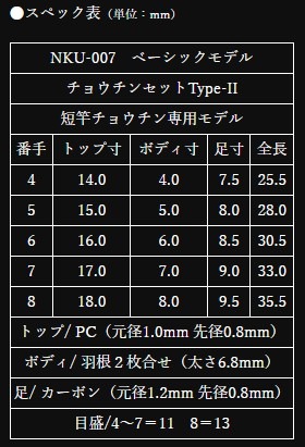 スペック表(単位:cm) トップ寸:14.0 ボディ寸:4.0 足寸:7.5 全長:25.5 トップ/PC(元径 1.0mm 先径0.8mm) ボディ/羽根2枚合せ(太さ 6.8mm) 足/カーボン(元径 1.2mm 先径0.8mm) 目盛/11