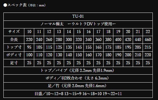 ノーマル極太ーウルトラDVトップ使用ーサイズ:10 スペック(単位:mm)全長:220 トップ寸:95 ボディ寸:100 足寸:25 トップ/パイプ(元径 2.2mm 先径1.9mm) ボディ/羽2枚合わせ(太さ 6.3mm) 足/竹(元径 2.0mm 先径1.6mm)目盛/8
