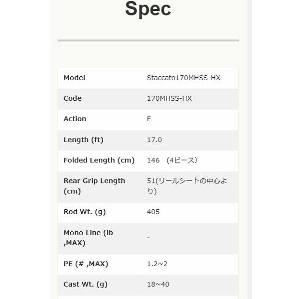長さ:17.0ft Folded長さ:146cm (4ピース) グリップ:51cm(リールシートの中心より) ウェイト:405g PE (# ,MAX):1.2~2 Cast Wt. (g)18~40 ※実物と色が違って見える場合があります。あらかじめご了承下さい。