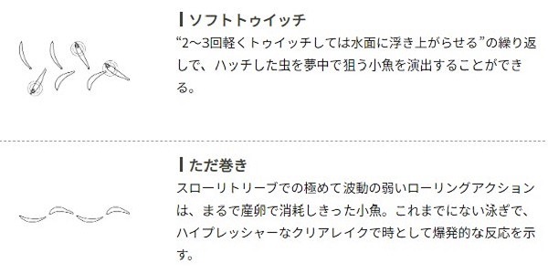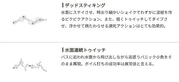 ベントミノー76はアングラーの多いハイプレッシャーな状況やベイトフィッシュが小さいフィールドでも、より多くのバイトを確実に得るために開発された。サイズダウンしても圧倒的誘発力は健在で究極のナチュラル3Dダートアクションでターゲットを悩殺する。最大の特徴であるベントしたボディは、泳ぐ力を失い水面に横たわる小魚をスーパーリアルに再現。止めているだけでもターゲットの反応が明確に違うことでその効果を証明してくれる。この視覚的要素もさるころながら、特筆すべきは他に類を見ない唯一無二のアクション。上下左右斜めと予測不能の3Dダートアクションは、ターゲットを疑わせることなく錯覚させ、現実にバイトに持ち込んでくれる。