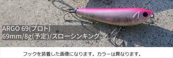 濱本国彦プロデュースの小型トップウォータープラグ「ARGO69」。ドッグウォーク・スプラッシュ・タダ巻きでのV字波紋など多彩なアクションで誘うARGOシリーズの特徴を踏襲しつつ、浮力をシンキングに設定することで小型プラグでありながら水面下でのルアーコントロールを容易にし、圧倒的な飛距離も実現している。シーバスやチヌのみならず、メバル・メッキなどのTOPゲームにも活躍する。