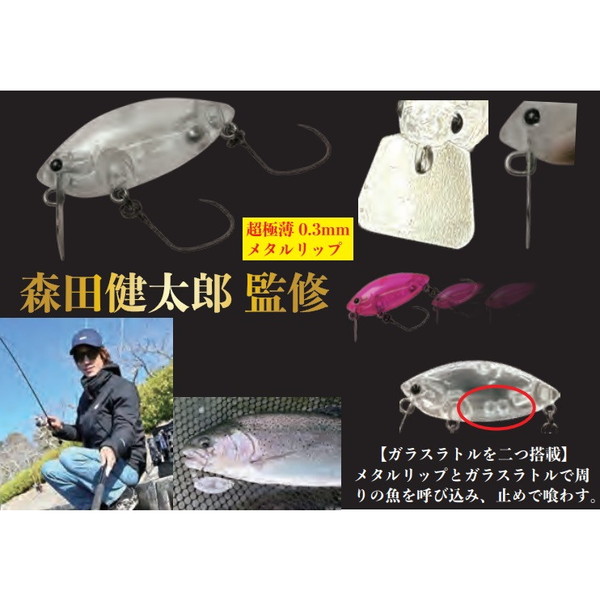 金属リップ採用で強い波動と反射効果により、広範囲の魚に対してアピールすることが可能。プラスチックリップには無いアピールがやる気のあるマスを素早く喰わせることに成功した。潜行レンジは 0cm~。 ロッドを下げて巻いた場合の最大が 40cm 程となる。( エステル 0.4 号使用 )メタロの最も効果的な使い方は『ストップ & ゴー』がオススメテクニック。