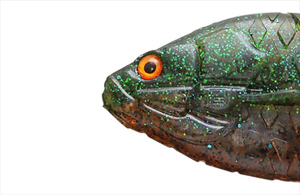 ブルーギル型ボリュームによる集魚効果と、オールマイティに使えるウェイトに注目した、ブルーギル型ワーム。カルティバ製マルチオフセット#4/0に合わせてボディを設計しました。ボディに対して垂直(横向き)にフックセットしますが、背部の空洞による浮力と、ネイルシンカーによるバランス取りによって、魚が泳ぐ姿勢やアクションを表現します。また、その空洞により、フッキングの良さも併せ持っています。ネイルリグの他、テキサスリグや、キャロライナリグなど、あらゆるメソッドに対応します。新開発のキャラメルスケール設計(PAT.P)ボディによる見た目のリアル感と、艶かしいS字アクションが特徴です。