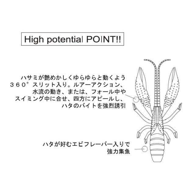 ハタが好むエビフレーバー入り専用ワーム。「ハタ喰い・蝦」は、ターゲットが警戒心を抱くことなく即座にバイトへ繋げられるよう、リアルなシルエットをとことん追求。また、まるで生きているかのような艶めかしい動きを演出するよう、爪の根本にはスリットを入れており、アクション、及び、水流の動きに追従するよう重きをおいたのが大きな特徴だといえる。※掲載している商品の画像は代表画像を表示しています。また実物と色が違って見える場合があります。あらかじめご了承下さい。