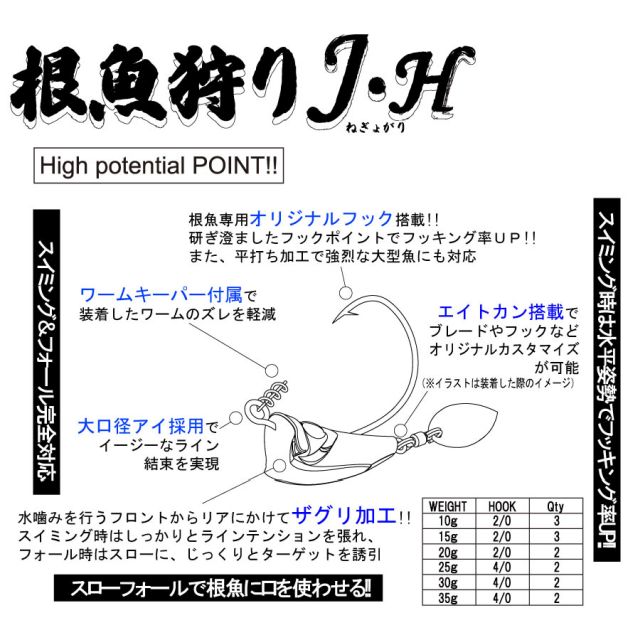 スイミング&フォール完全対応 スイミング時は水平姿勢でフッキング率UP!! スローフォールで根魚に口を使わせる!! 水噛みを行うフロントからリアにかけてザグリ加工!!スイミング時はしっかりとラインテンションを張ることができ、フォール時はスローにじっくりとターゲットを誘引!!ワームキーパー付属で装着したワームのズレを軽減!! 大口径アイの採用でイージーなライン結束を実現 エイトカン搭載でブレードやフックなどオリジナルカスタマイズが可能※掲載している商品の画像は代表画像を表示しています。また実物と色が違って見える場合があります。あらかじめご了承下さい。