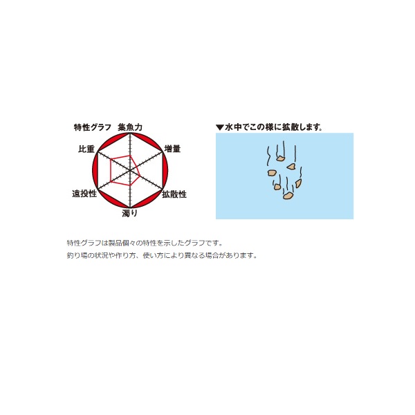 優れた機能で、あらゆる釣り場に対応。アミエキス、酵母、カキガラ、ムギ、コーンなど、チヌが好む5つの集魚成分と、適度な濁りでチヌにアピール。10秒間で約2.4mと、深いタナもスピーディに攻められる重さ。程よくまとまり、遠投性も効くので遠くのポイントも狙えます。波止・磯・渚などのあらゆる場所などさまざまなシーンに使える配合エサです。