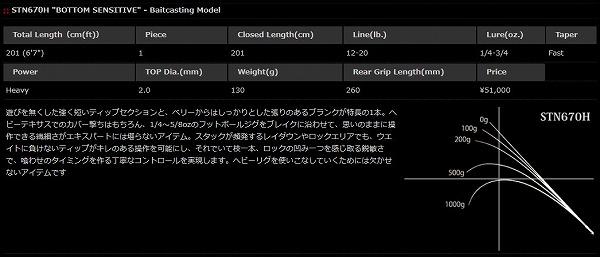 Total Length(cm(ft)):201 (6’7”) Line(lb.):12−20 Lure(oz.):1/4−3/4 Taper:Fast Power:Heavy Weight(g):130