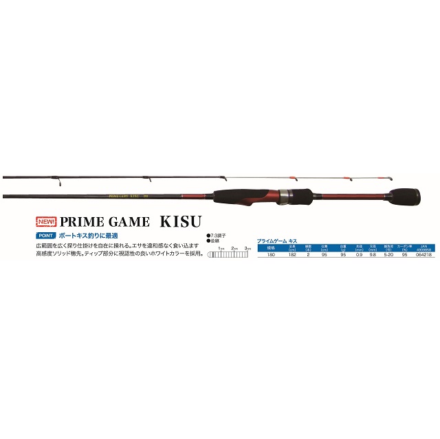 全長(cm):182 継数(本):2 仕舞(cm):95 自重(g):95 先径(mm):0.9 元径(mm):9.8 鉛負荷(号):5〜20 カーボン率(%):95